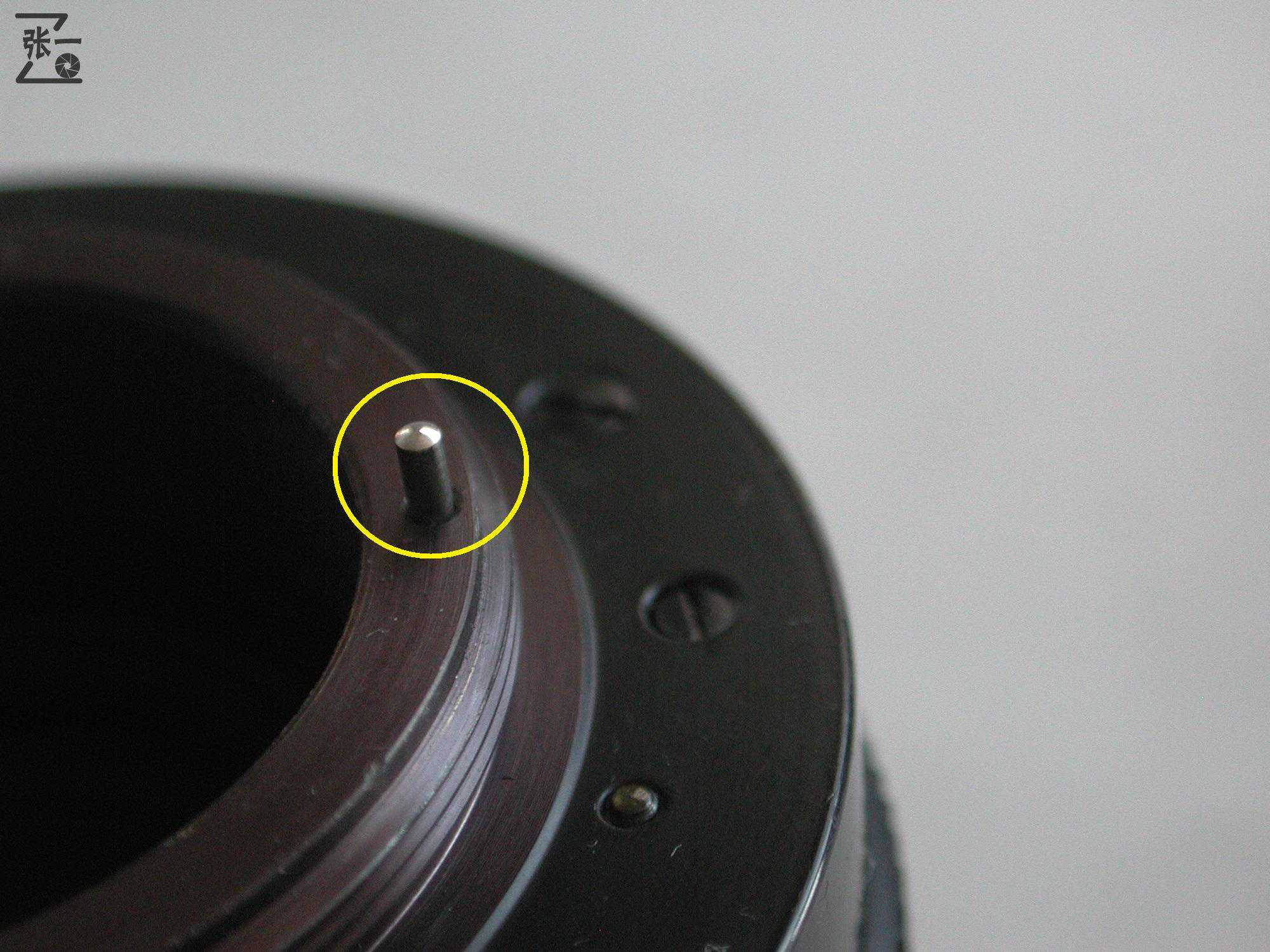 同大多数M42镜头一样,这款Flektogon35/2.4镜身上有A/M档转换开关。使用A档时,按下快门后镜头可以在大多数M42机身上自动收缩光圈,而使用M档时则只能手动调节光圈了。通常情况下,将这款Flektogon35/2.4镜头镜头转接到其它机身上使用时,通常应该使用M档,除非您购买的M42转接环带有顶针(下图黄圈内)挡板。