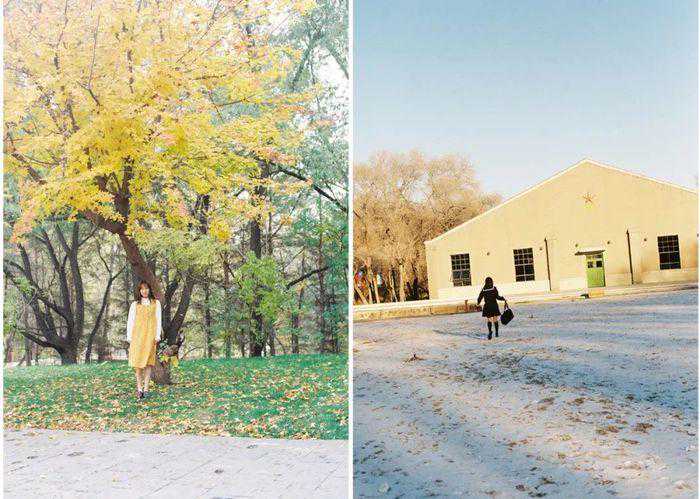 其中我比较喜欢的元素有大片的绿草地、棋盘、鸽子还有操场黄色的休息区等。学校里的木质椅子和门,通过胶片照片呈现出来的颜色也很好看。