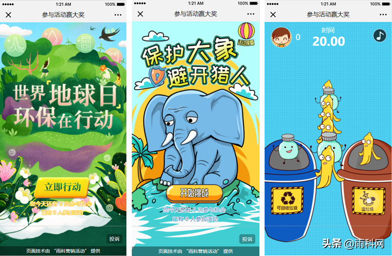 开通营销活动相应版本后即可发布分享用户参与(月版本需联系客服开通);现在就搜索【雨科网】平台注册账号进入营销活动后台创建地球日线上主题趣味环保h5小游戏吧。