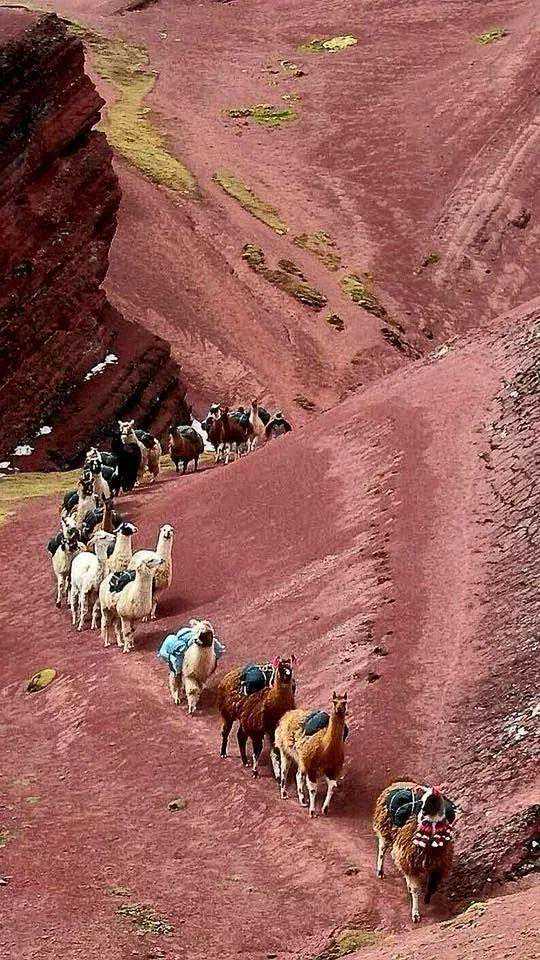 1.红色的花田里,人们排队背箩筐