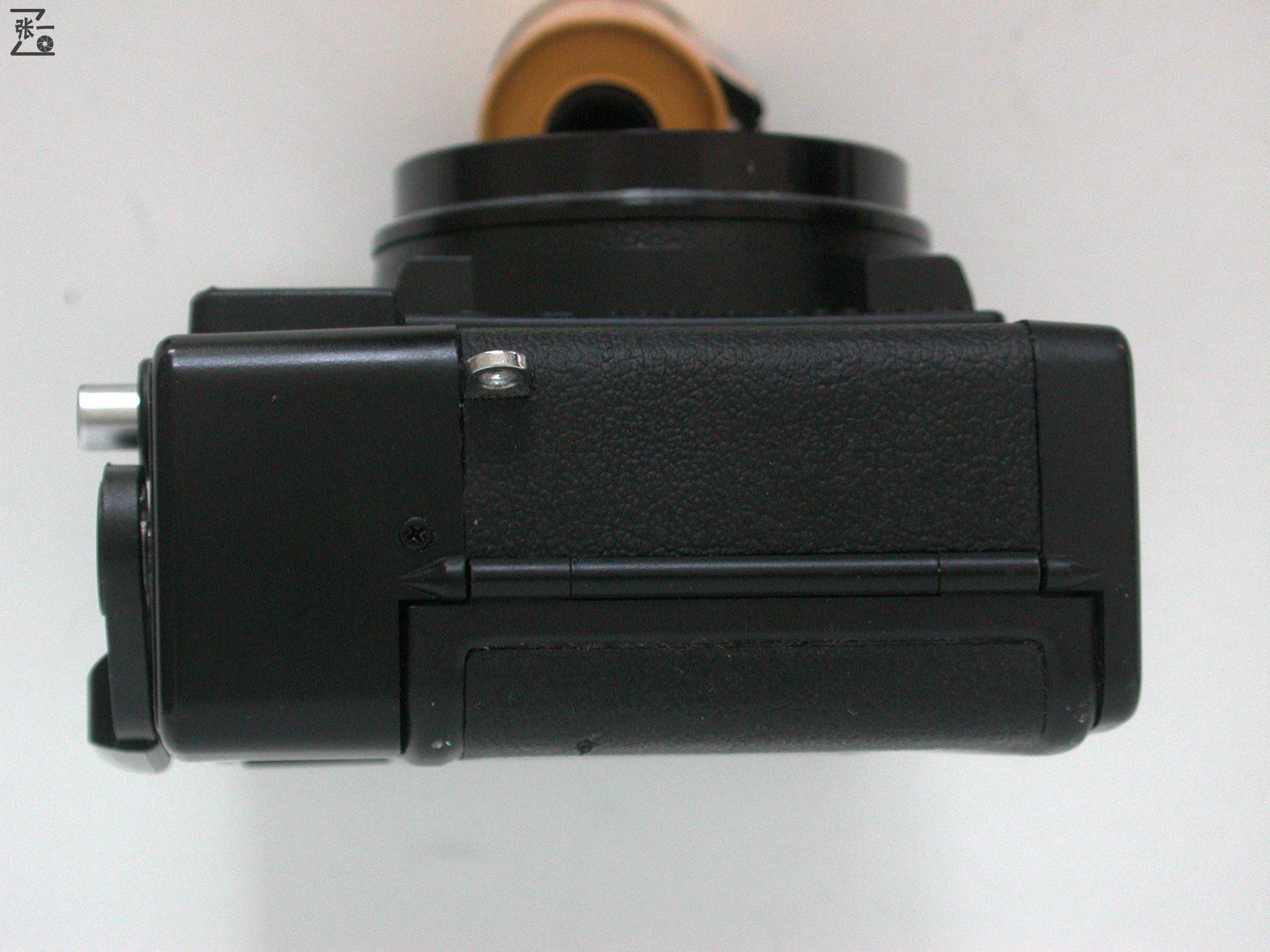 这款KonicaC35AF的镜头盖设计也非常有趣,是与用于对焦的两个测距窗口的保护盖合为一体的,非常像英文字母“T”。我个人估计采用的设计,其主要目的还是为了保护该机的自动对焦系统。毕竟是世界上首台具备了这样功能的照相机。但有一点我觉得很奇怪,这台相机的机身上并没有任何产地标识,倒是镜头盖和原装的相机套上有Japan的字样。