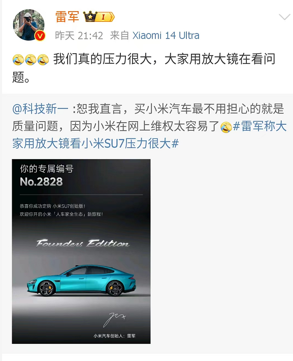 正如小米创始人雷军昨天在回复网友关于小米汽车质量问题时所说,大家用放大镜在看问题。