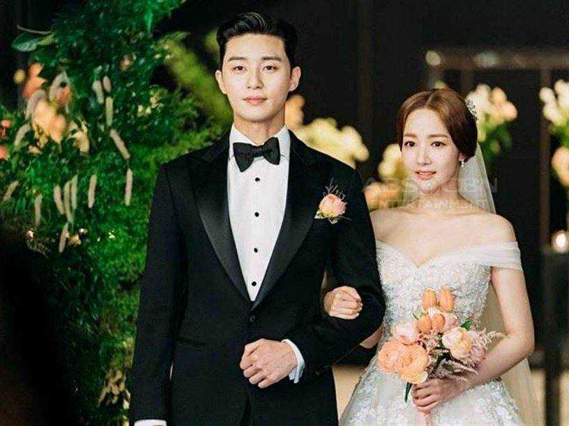两人最后举办了浪漫的婚礼,这件婚纱也很适合朴敏英的身材曲线~