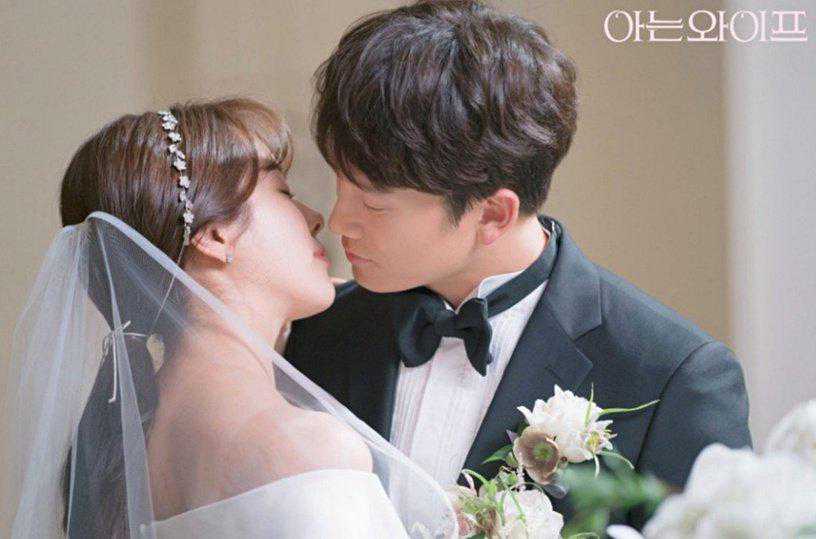 韩智旼在《认识的妻子》中与池晟饰演进入倦怠期的夫妇,但是剧中也有过美美的婚纱造型,缎面的婚纱造型非常典雅,搭配韩智旼的低马尾造型、更是非常有气质。