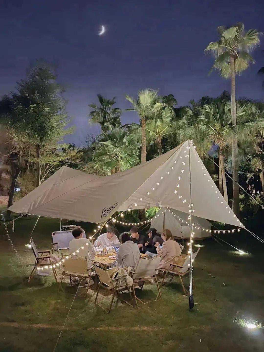 在夜幕降临以后,鸟鸣虫唱,开启了一场天然音乐会,闲适又有趣。在这样的氛围里,围炉夜话,看一场电影,或静静地感受微风,夜观繁星……在没有天花板的地方肆意放空。