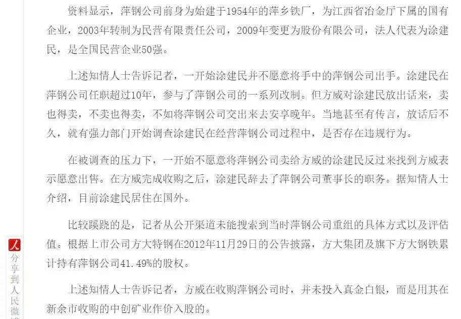 当时有传言说,方老板撂完话,就有强力部门开始调查涂建民在经营萍钢公司过程中,是否存在违规行为。