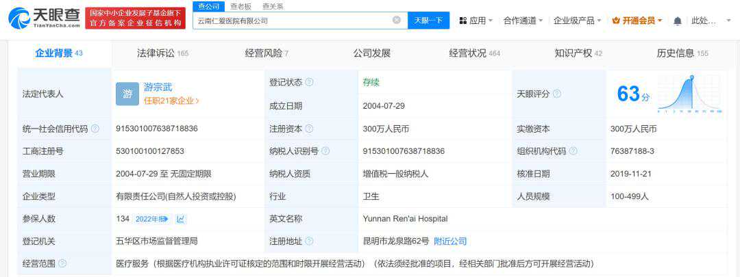 云南仁爱医院有限公司成立于2004年,法定代表人游宗武。
