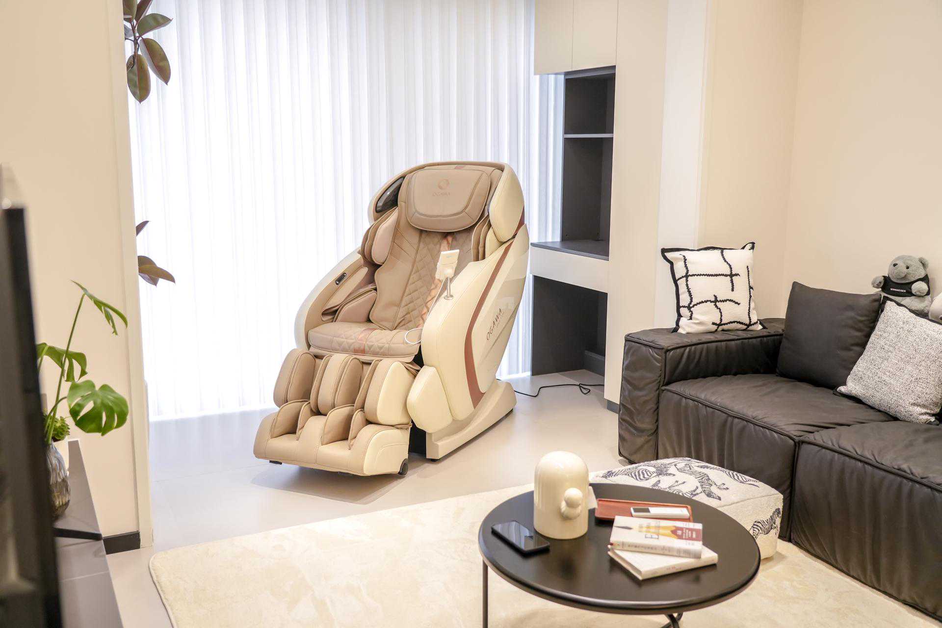 奥佳华7808S+配色有金砂杏、骄阳橙和原木棕三种,我入的金砂杏,跟我家简约柔和的家居风格非常适合。