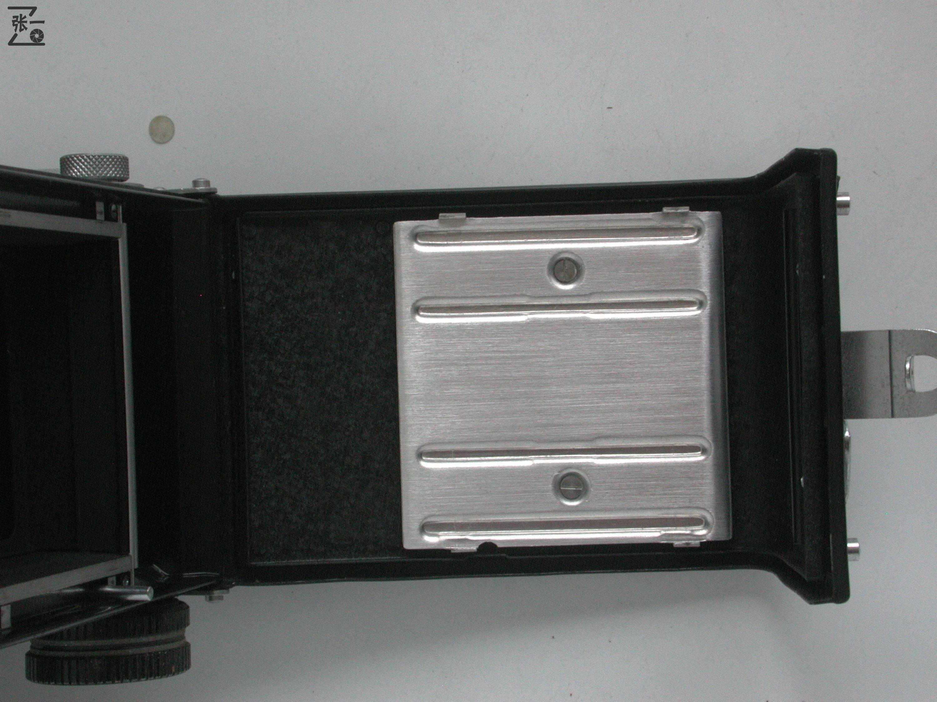 这款WalzflexIIIA的过片采用了自动计数的设计,应该说在那个年代应该算是比较先进的了。因此在该机的机背上,没有也无需设计用来计数的红窗了。不过采用自动计数的双反相机,就只能拍摄一种6x6厘米画幅的底片了。