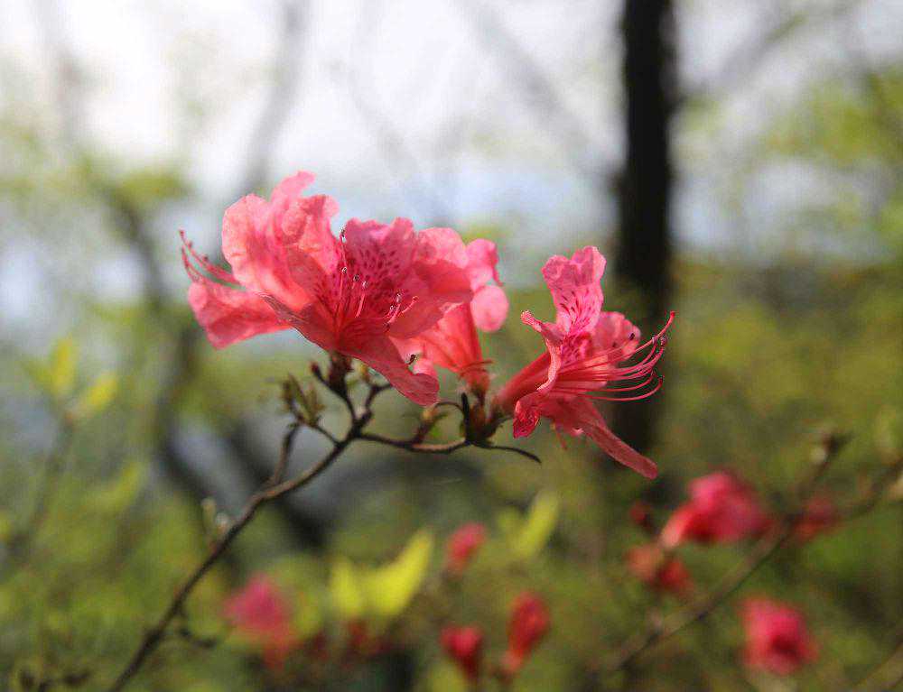 好在满山的杜鹃花儿处处露出笑脸,密林深处时时传来各种鸟叫,叽叽咕咕地鼓励我们。除了我们常见的杜鹃花,这里还生长着大别山特有的杜鹃品种“云锦杜鹃”,大朵大朵的花儿,很类似粉白色的芍药花。随着海拔的不断升高,在山脚还盛开的杜鹃,在山顶竟是含苞待放。有人唱起山歌来:“夜半三更盼天明,寒冬腊月盼春风;若要盼得红军来,岭上开遍映山红!”好一首应景的歌!杜鹃花不正是“映山红”吗?