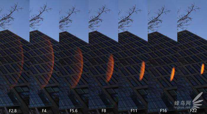 通过以上图片框选的位置,可以明显发现照片四周有一道炫光,照片右侧的橙红色炫光会随着光圈的收小而减弱,但一直到F22也未消失;而照片左侧的区域也可以发现,有一道青紫色的炫光从光圈F8时开始出现并一直扩大,到光圈F16时最明显,两者处于此消彼长的过程。