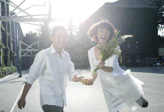 还有这对明星,婚纱照没有华服,也没有盛大的婚礼,只有简单朴实的一组照片。他们牵手回去母校,就顺便把婚照也拍了。这样率真不铺张浪费,也不失为一种好的选择。
