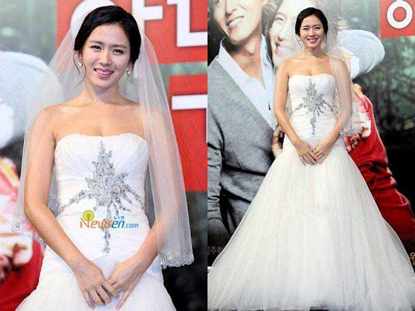 孙艺珍前几年与金柱赫、朱相昱等主演的爱情喜剧片《妻子结婚了》发布会时,也直接穿着婚纱登场,显得婉约动人!