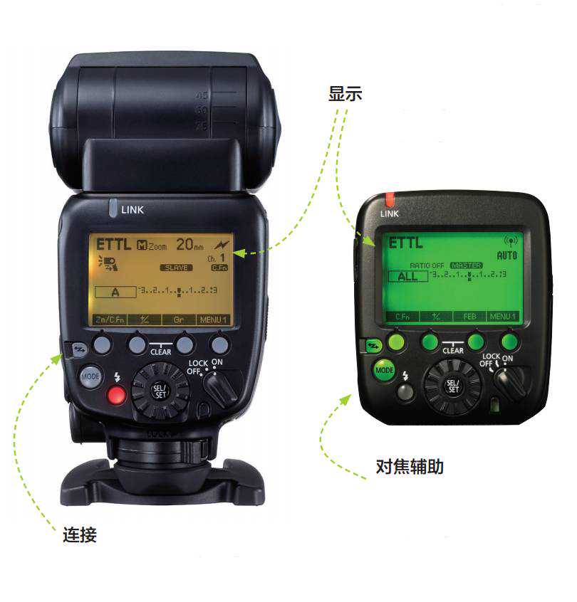 连接:左侧佳能600EXII-RT是一款自带无线电引闪功能的高端闪光灯,无论把它直接插在热靴上还是通过延长线放在其他位置上它都可以作为无线引闪之用。右侧的ST-E3-RT引闪器只能放在相机热靴上使用。两者通过无线电连接其他闪光灯的操作方式是一样的。