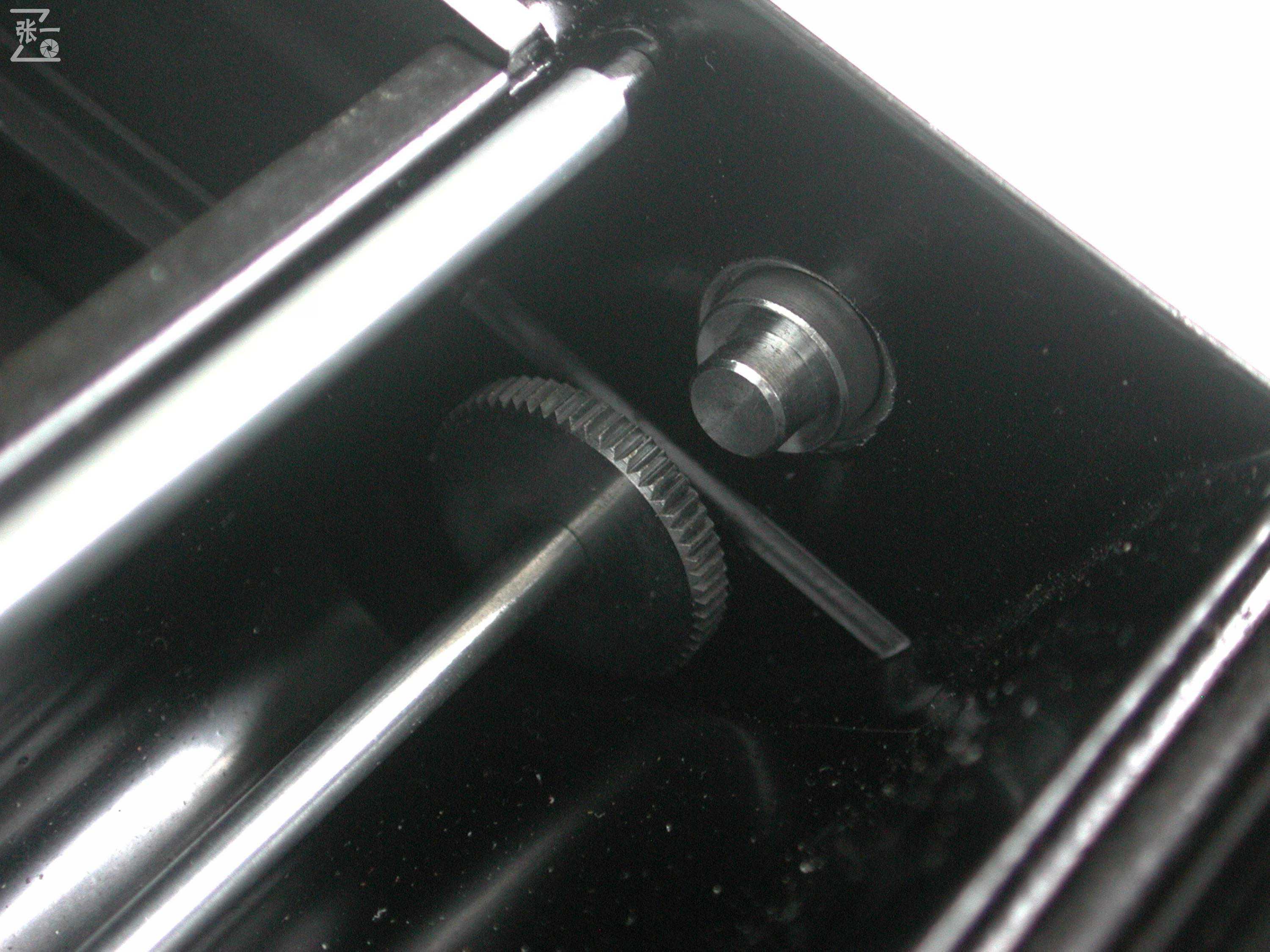 同其它自动过片计数的双反相机一样,这款WalzflexIIIA的计数器也是通过胶片仓内的齿轮和胶片的衬纸摩擦来实现的。