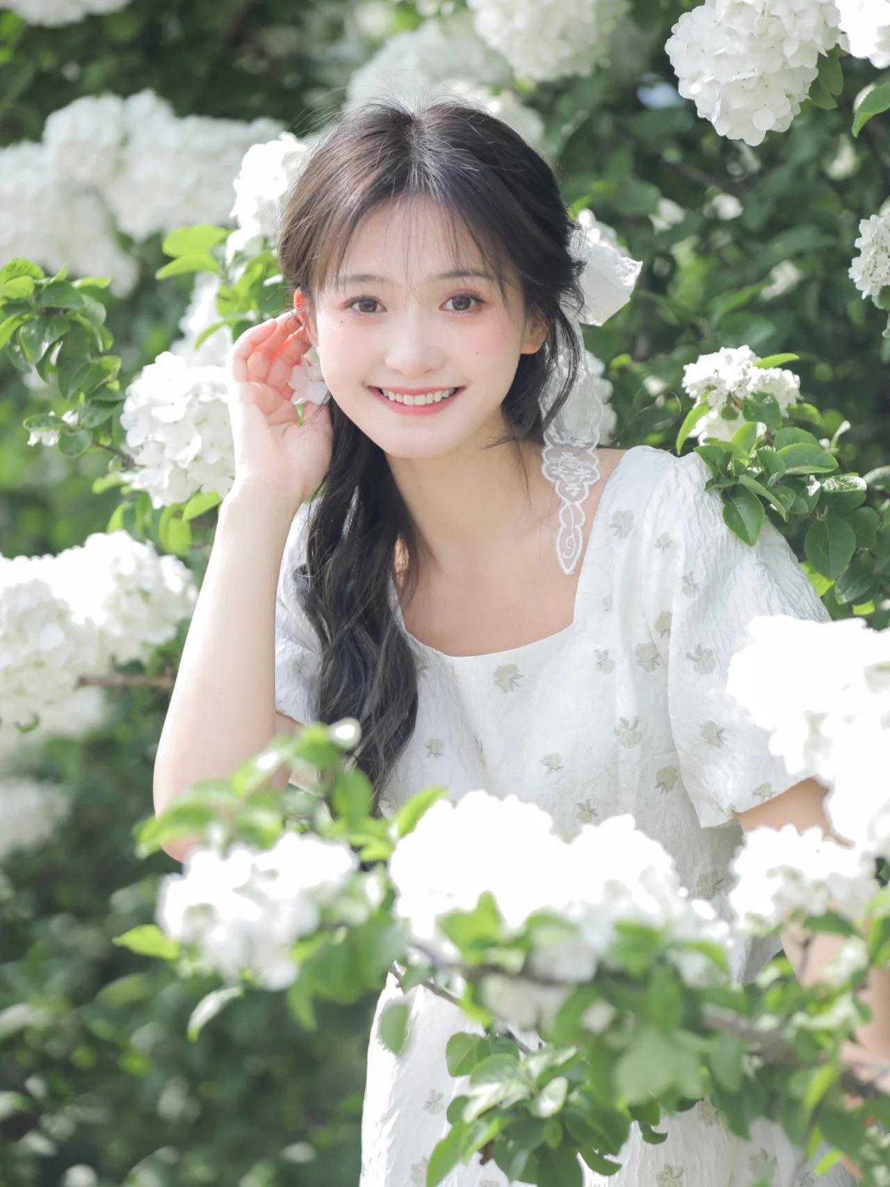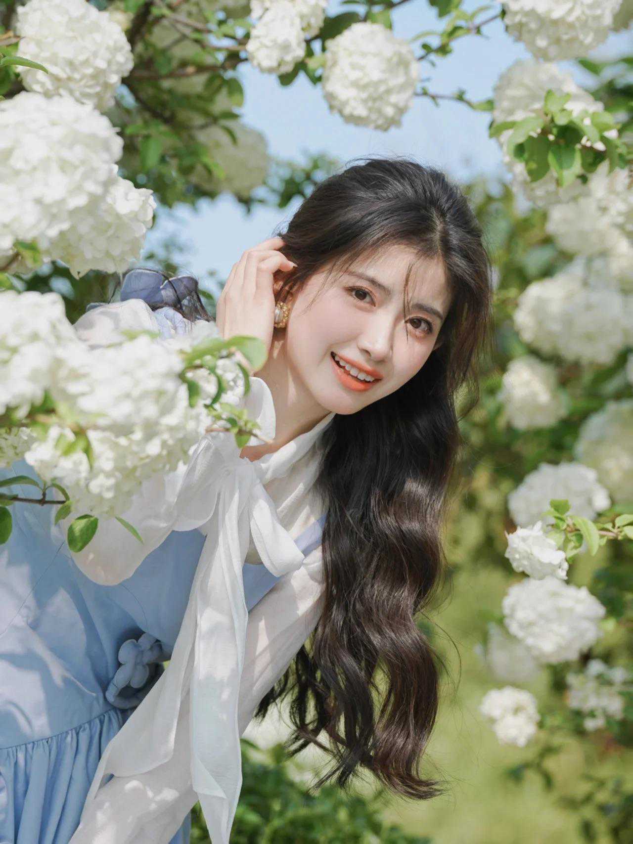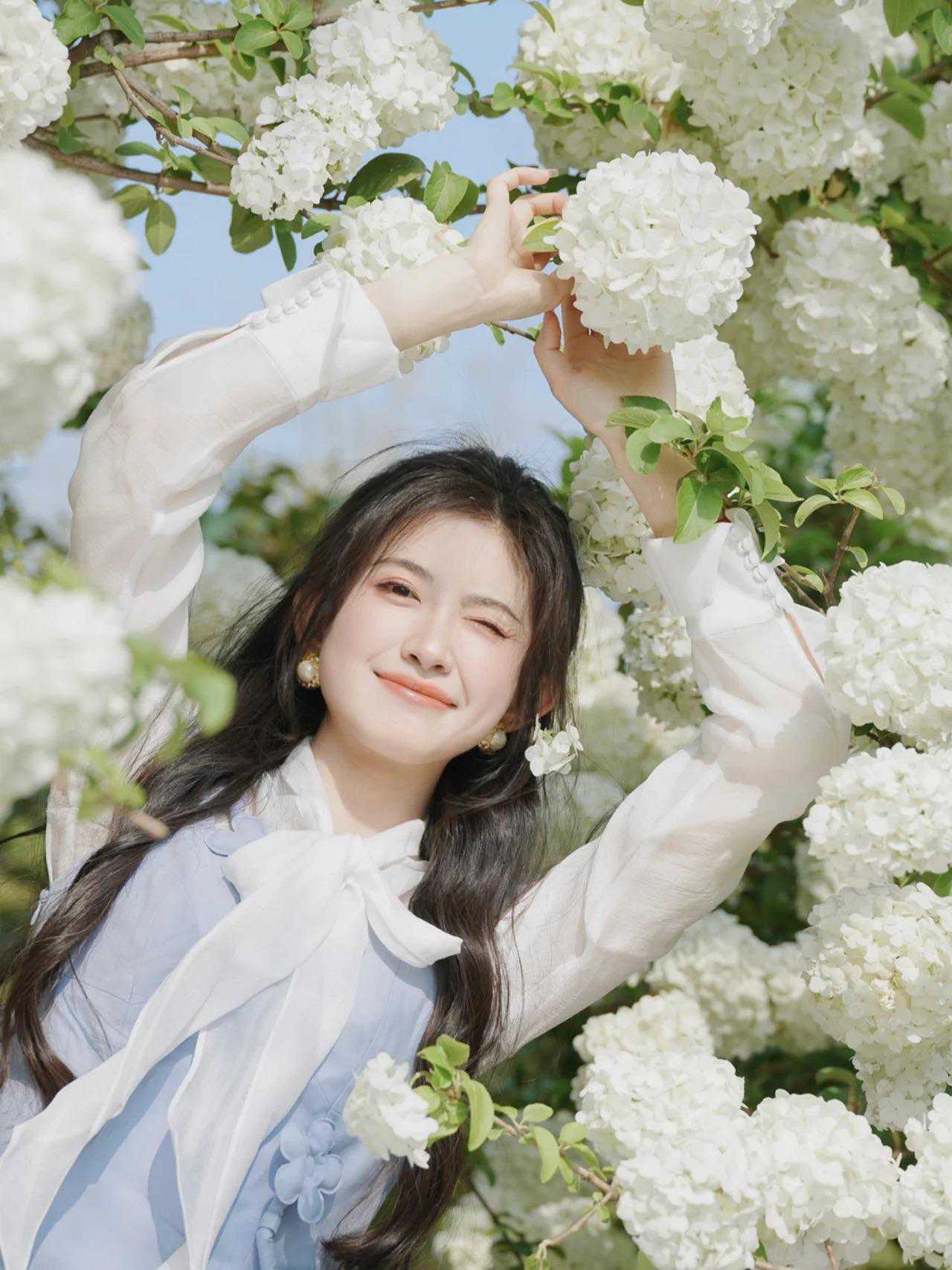 拍绣球花人像,百变丰富的姿势能突出模特良好的表现力,如倚靠花丛、轻抚花朵、低头闻花香、回眸一笑等。