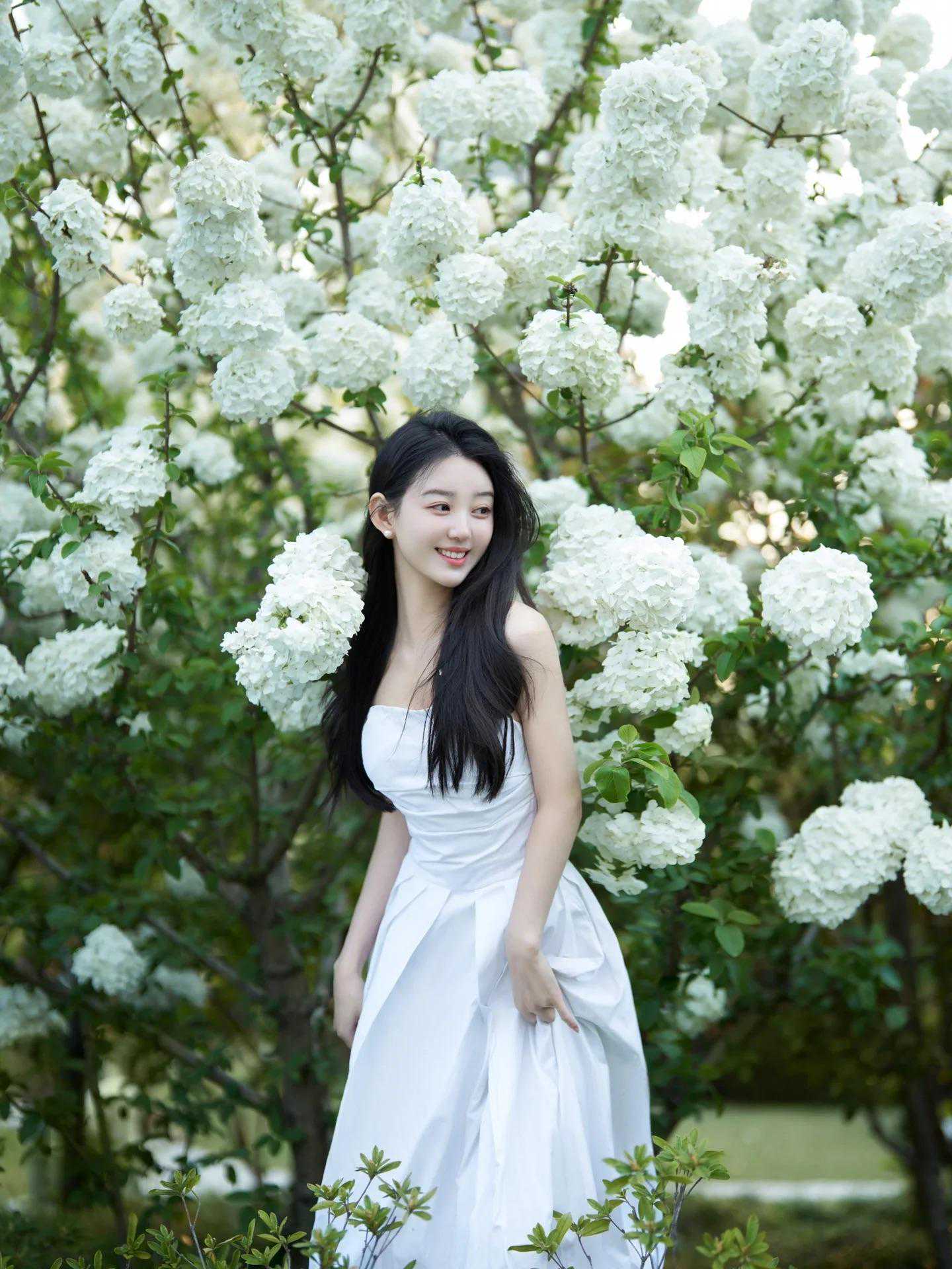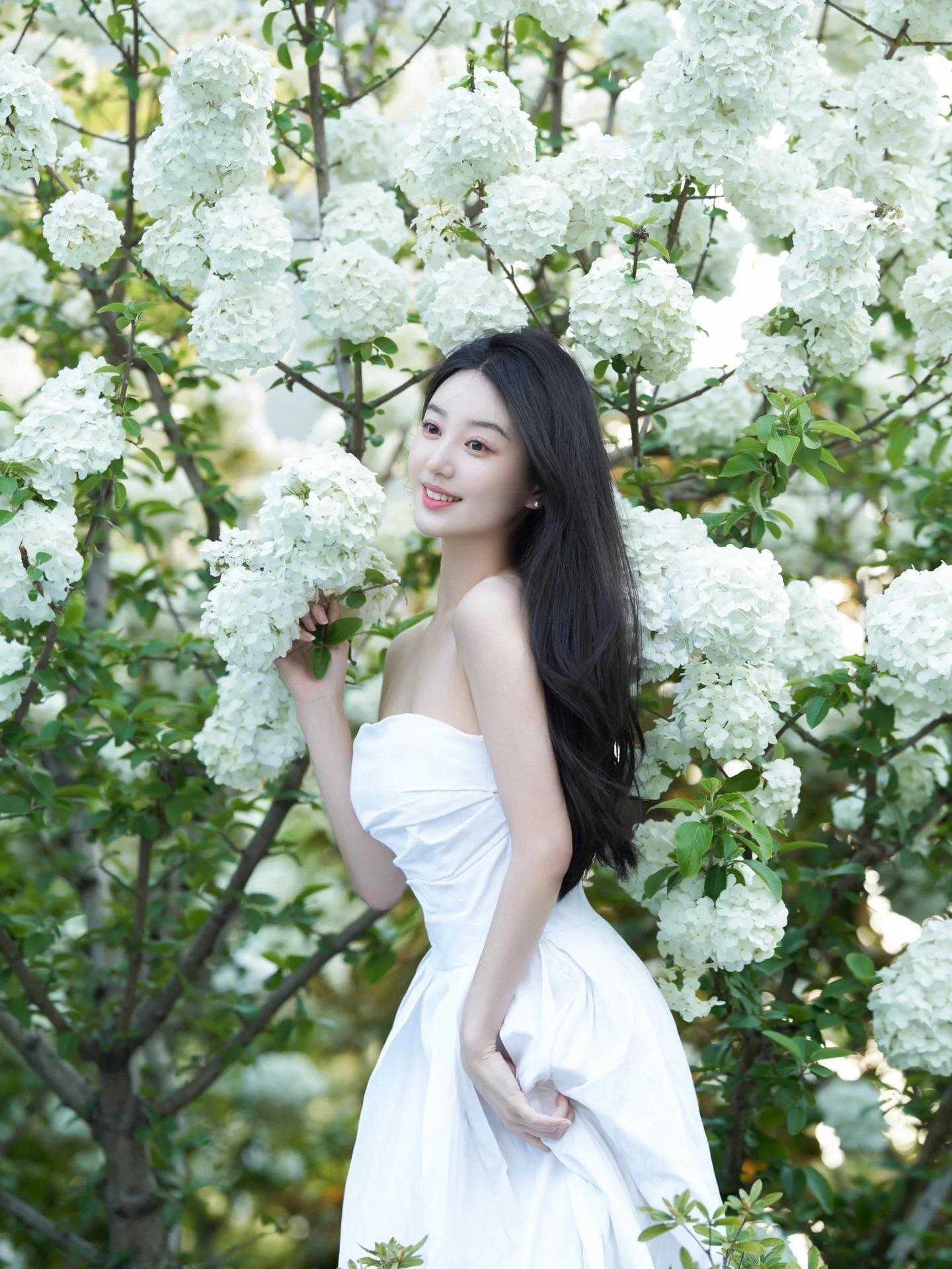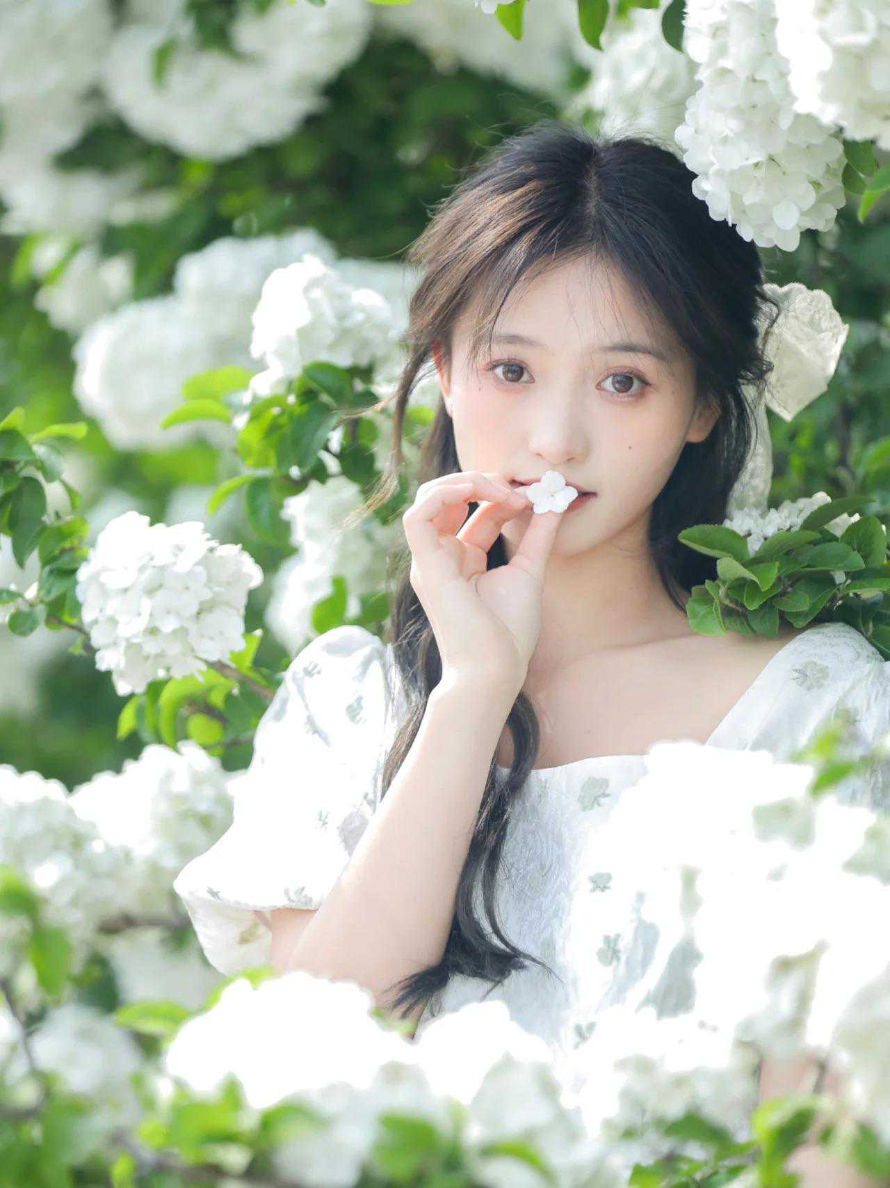 拍绣球花人像,百变丰富的姿势能突出模特良好的表现力,如倚靠花丛、轻抚花朵、低头闻花香、回眸一笑等。
