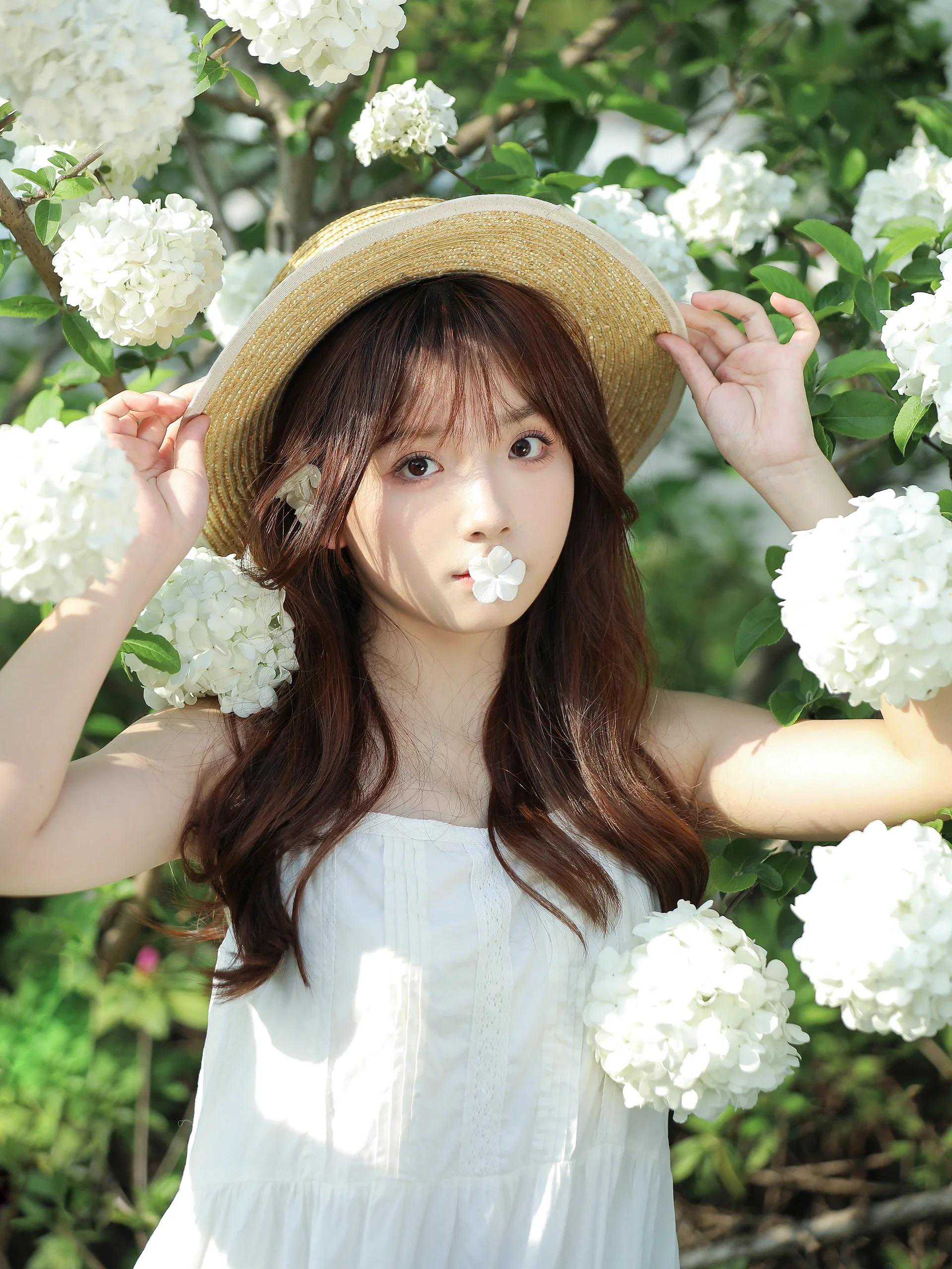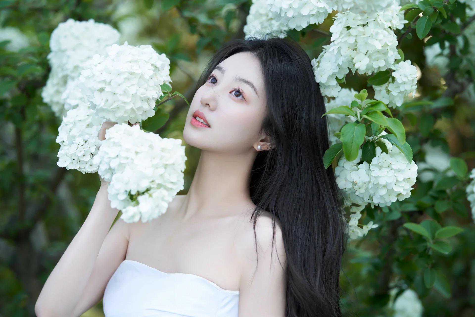 当然,也可以结合绣球花的特性,设计一些模特与花互动的动作,如手持花朵、藏身花丛这些与花互动的姿势,帮助模特更好地融入拍摄环境。