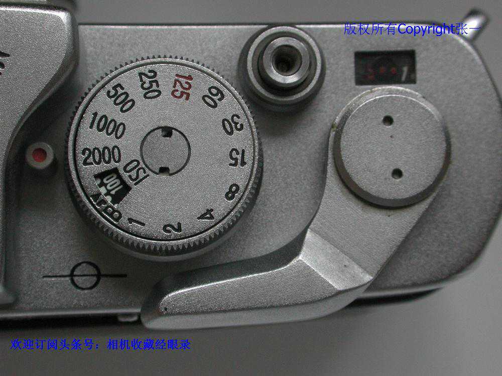 2、采用金属纵走焦平面快门,在日本COPAL公司定制。从B门,1-1/2000秒,为当时速度最快的快门。快门动作轻柔,时滞10毫秒。在无电池的情况下,所有操作均可完成。快门按钮设有快门线螺旋,方便使用快门线拍摄。