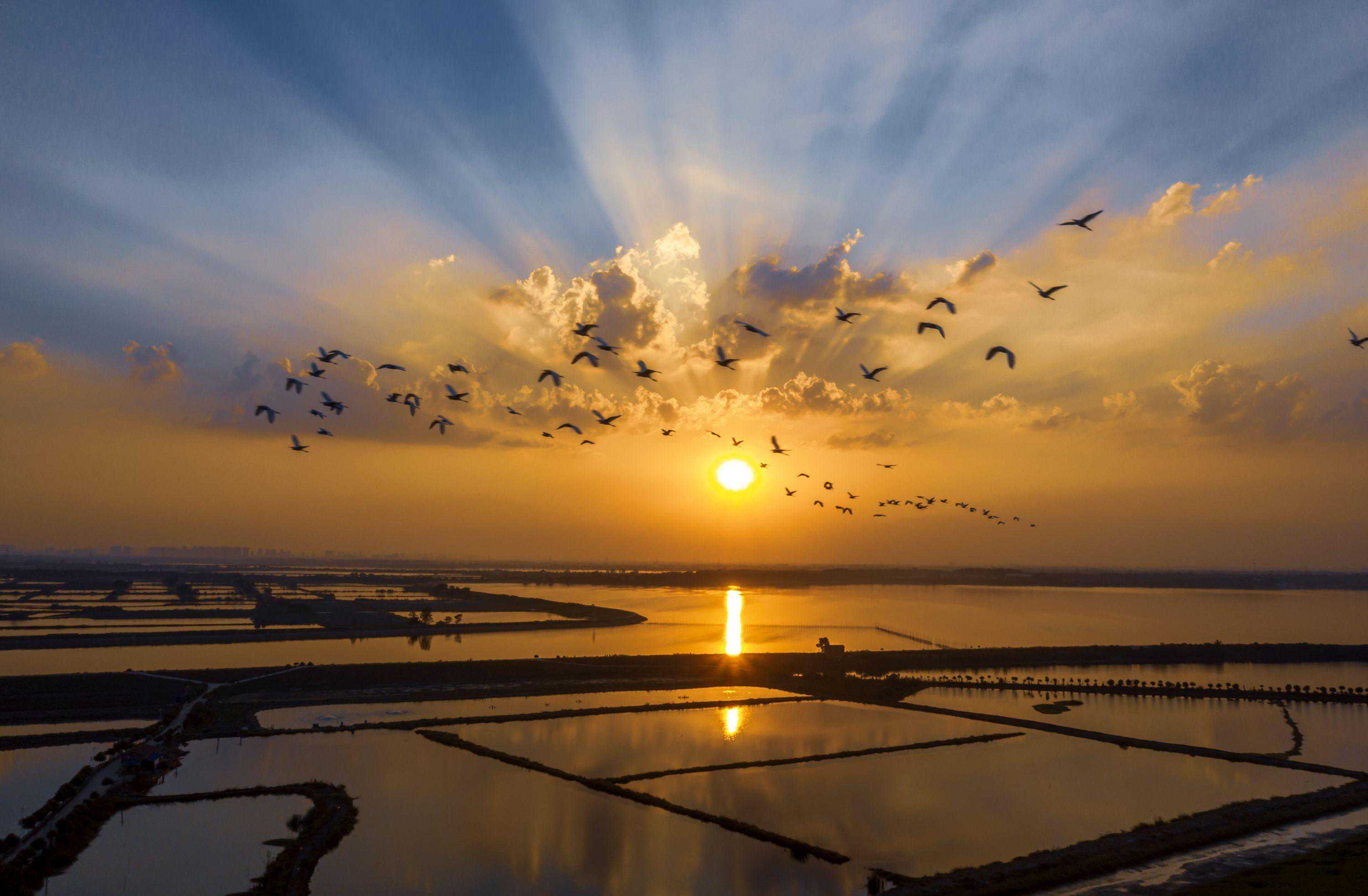 《白鹭向阳》,秋收时节,新洲区仓埠街处处喜丰收,白鹭一路欢歌,向着太阳飞去。城市摄影队龚建国摄