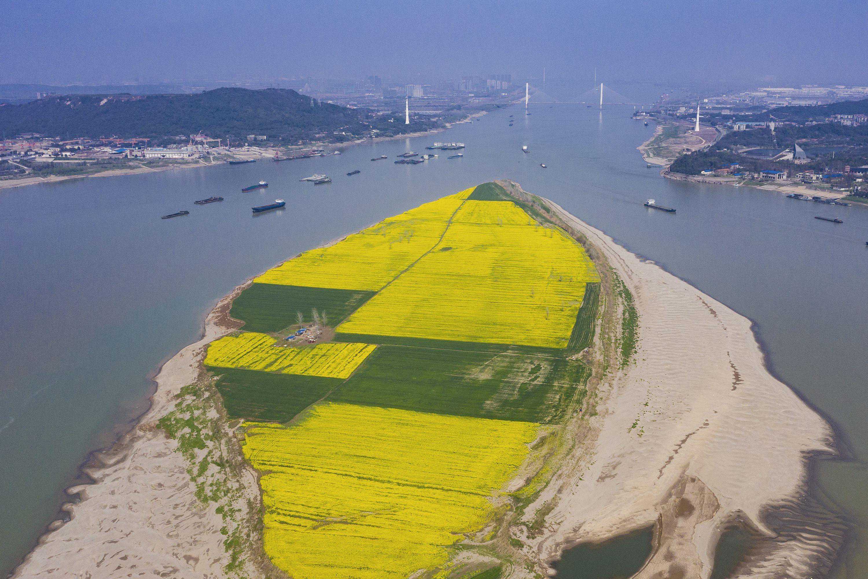《破浪前行》,长江靠近军山大桥一段江中绿洲上,大片大片金黄的油茶花盛开着,绝美壮观,好似一艘破浪前行巨轮的船头。城市摄影队陈亮摄