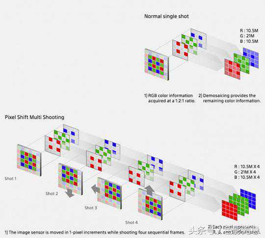A7RM3充分运用五轴防抖组件,推出像素转换多重拍摄模式,该功能与宾得“像素偏移分辨率”模式类似,在这种模式下,相机以1像素增量精准位移,拍摄4个单独的像素移动影像,包含总共约1亿6940万像素数据。需要注意的是这4张照片并不能像宾得那样机内合成,要在电脑上使用“ImagingEdge”应用中心的软件进行合成和处理产生约4240万像素的照片。