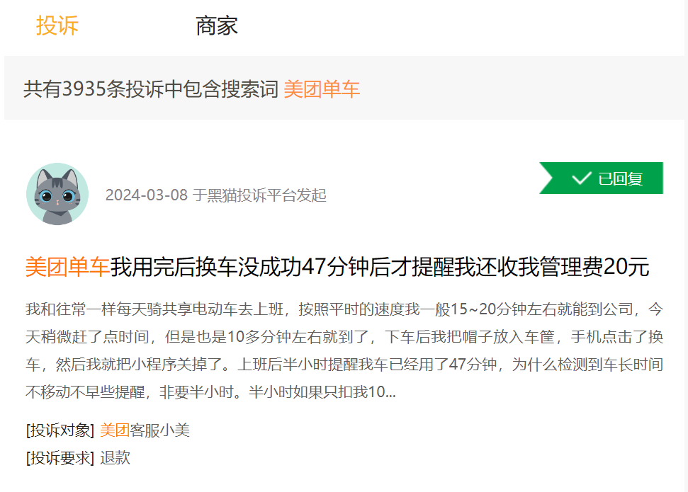 在运营共享单车的过程中,美团单车也受到了不少的用户差评,可以看到在黑猫投诉上,关于美团单车的投诉超过了3900条,涉及定位不准、乱收费等问题。