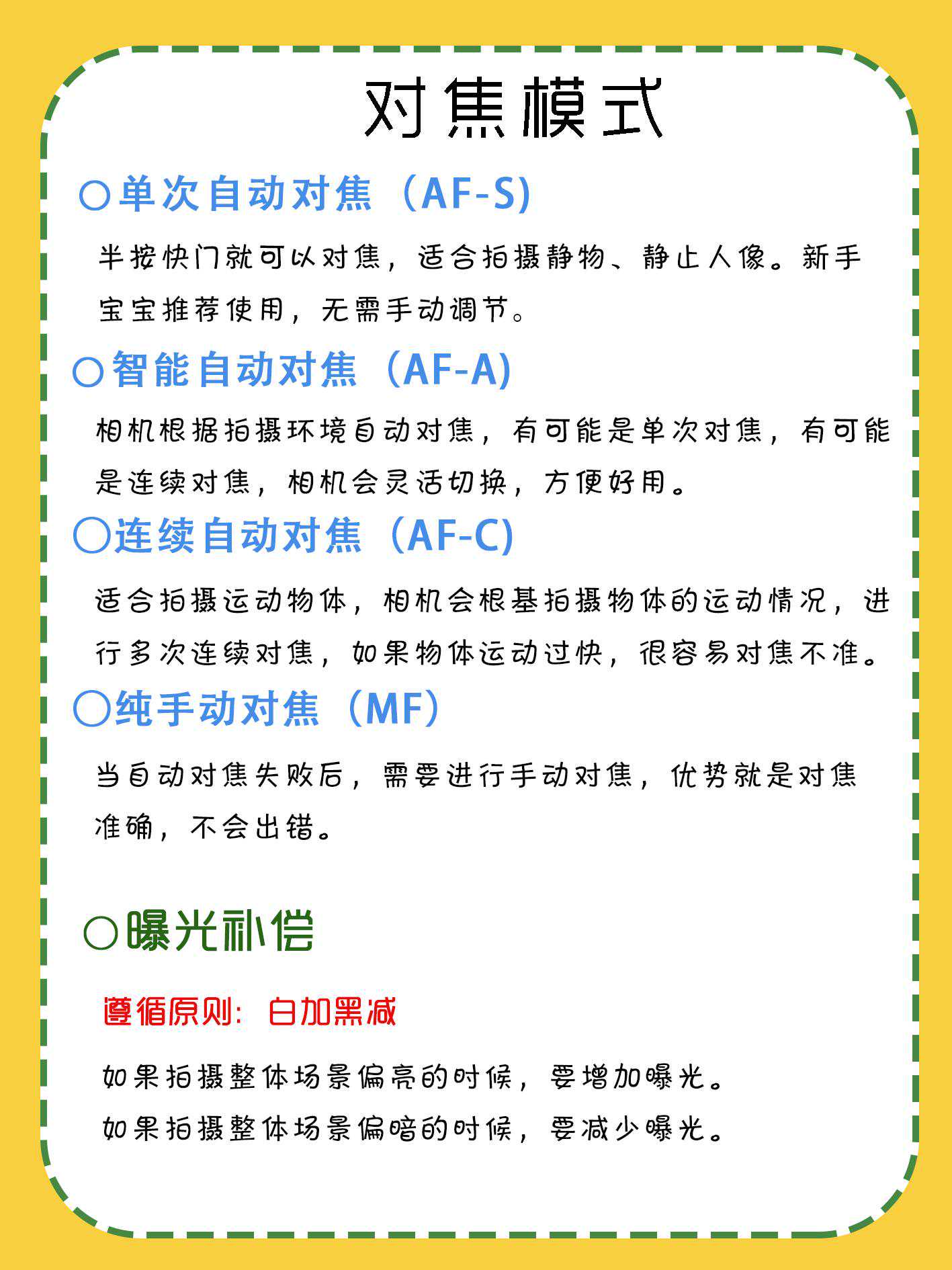 今天对前几天讲解的相机基础参数做一个总结,再给大家分享剩下对焦模式、测光模式和白平衡这三个参数