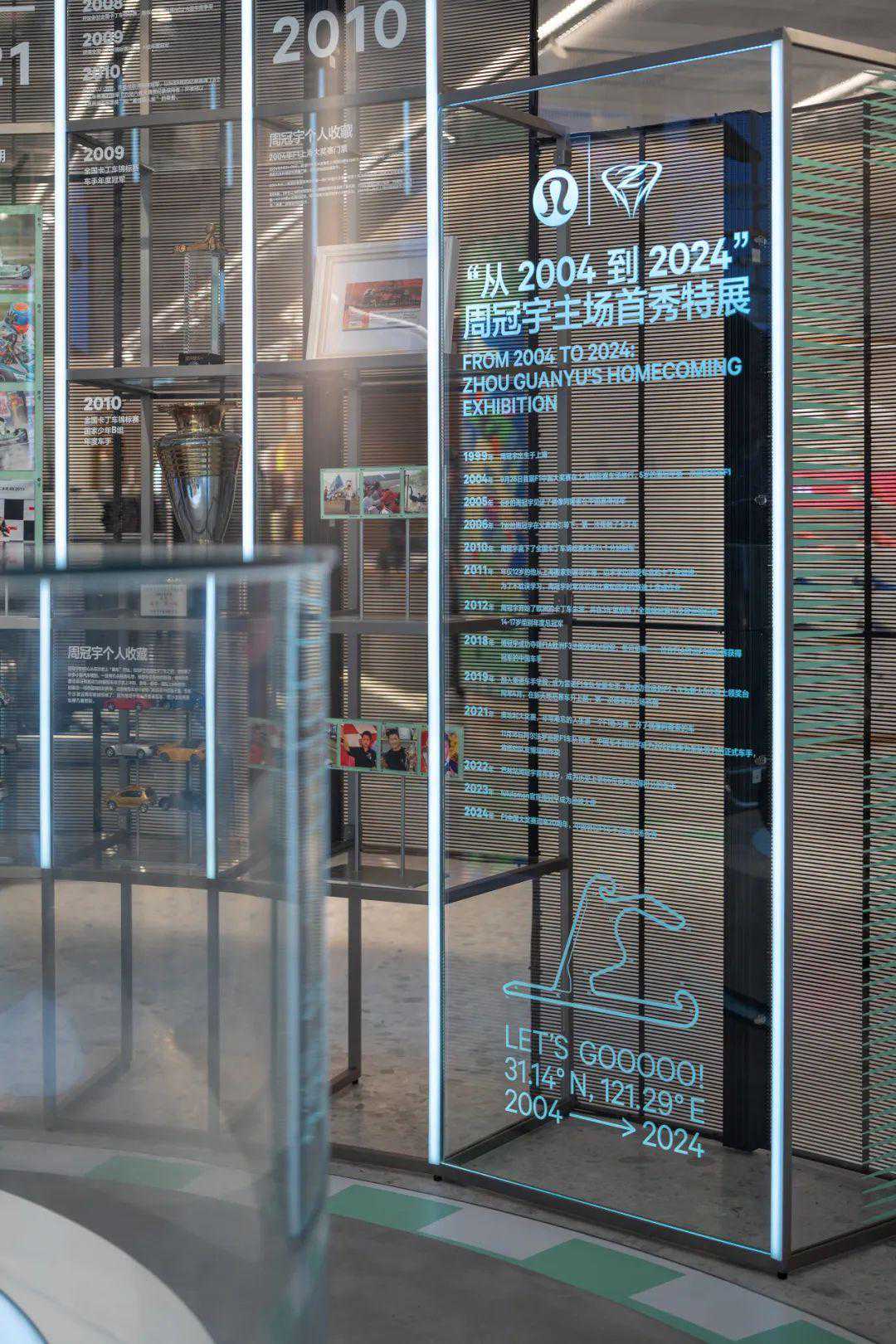 因此,纵使距离比赛开始还有半个月时间,但以此为核心的相关活动已拉开序幕——4月2日起,「从2004到2024」周冠宇主场首秀特展正式登陆lululemon上海静安嘉里中心门店,以精心布局带领车迷与客人一起回顾周冠宇的20年成长步调。