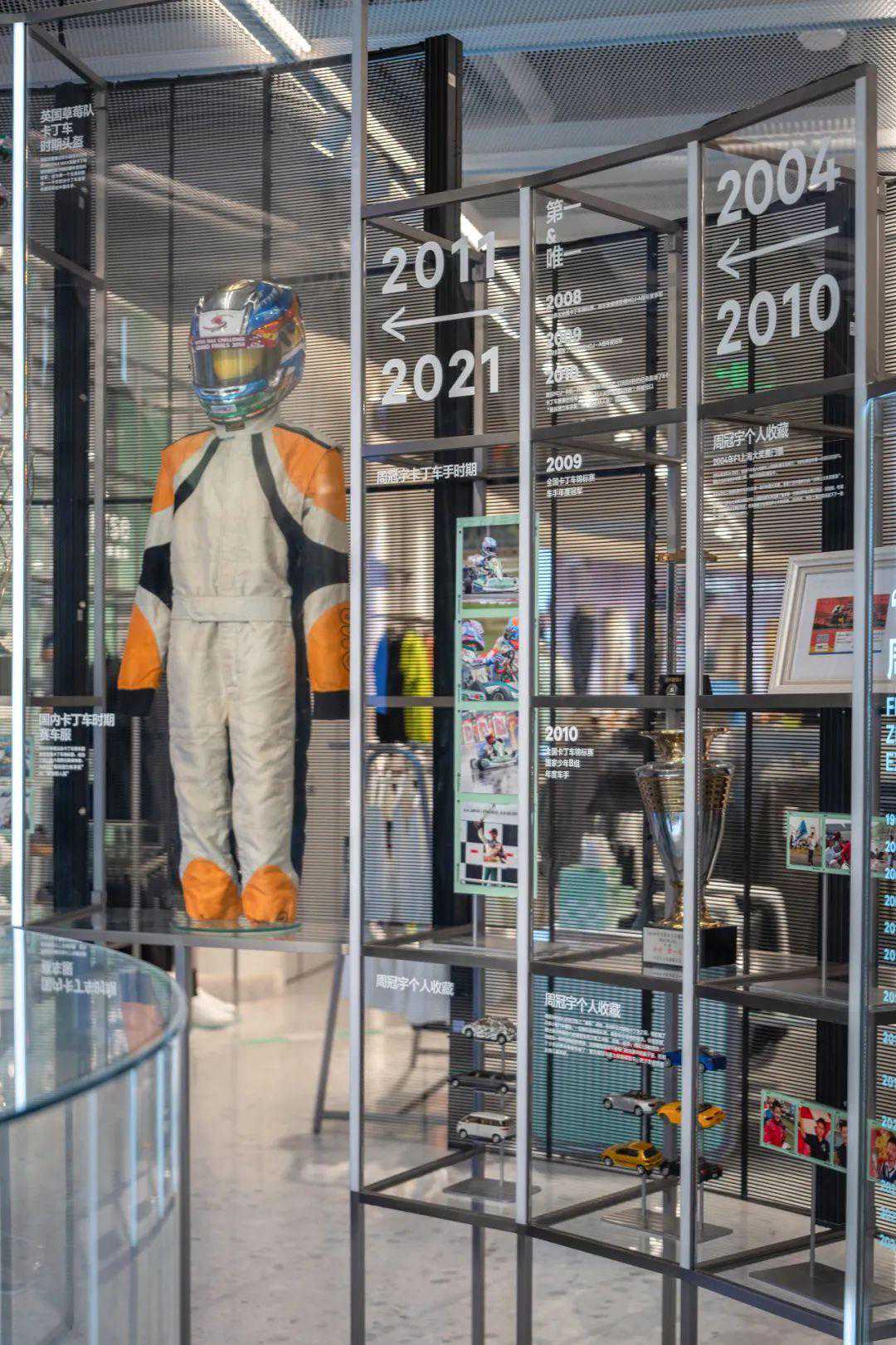 从8岁那年获得的第一座卡丁车冠军奖杯,到14岁那年获得RotaxMax英国卡丁车锦标赛和欧洲挑战赛年度双料冠军的奖杯与赛车,再到22岁那年获得的F2阿布扎比站冲刺赛冠军奖杯……周冠宇赛车生涯的每一个里程碑时刻,在这场展览上都能够找到见证。