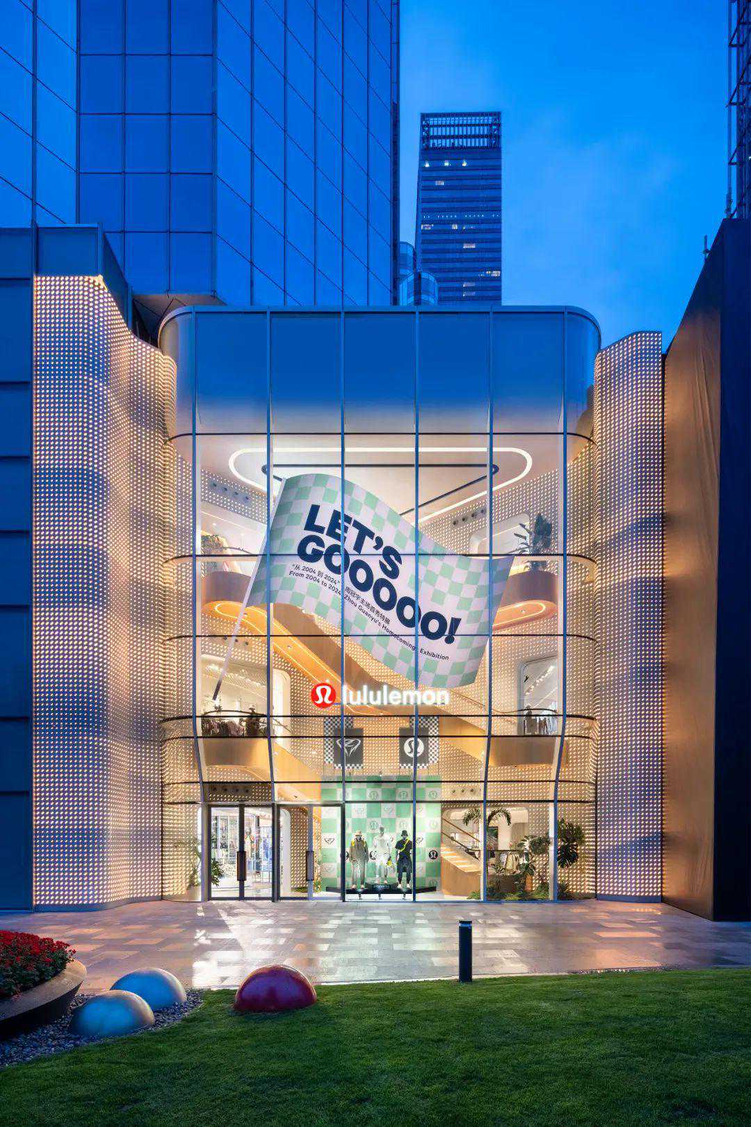此次展览期间,lululemon上海静安嘉里中心门店外立面装饰了品牌与周冠宇的联合标识,以及含有周冠宇经典加油语的巨幅旗帜