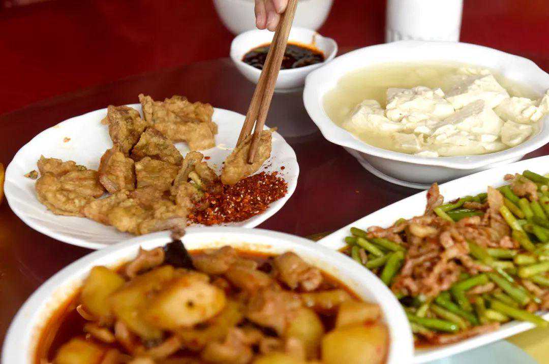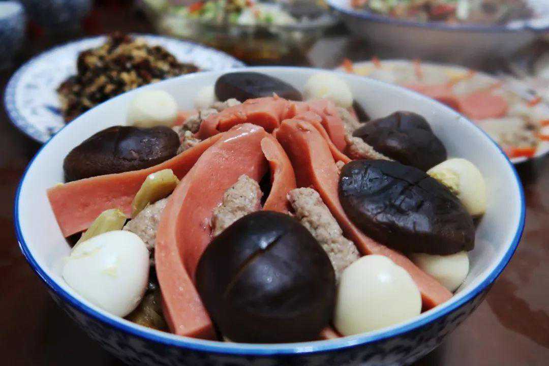 主菜基本上围绕猪肉设计,主要的烹饪方式是蒸。上蒸笼前,猪肉都要先在锅里煮过,原理和“回锅肉”先煮过再炒,吃起来肥而不腻一样。打头炮的是炸酥肉,在其他菜未做好时,金黄香脆的酥肉足以让大家解馋。
