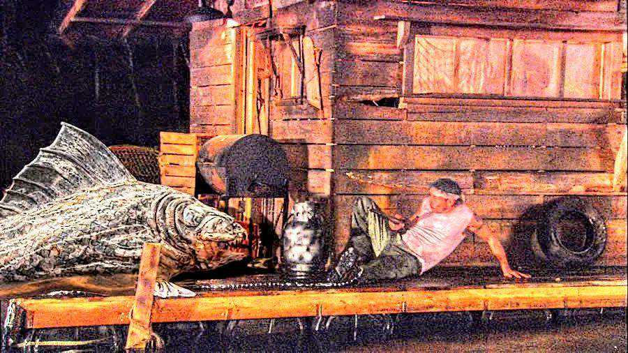 海报上,凶猛的巨型魔鱼即将偷袭蹲在河里彷徨的男女。
