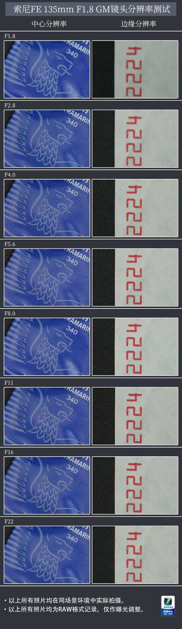 接着,我们来看看索尼镜头在各档光圈分辨率方面的表现。
