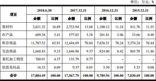 2015年至2018年1-6月,奥普家居存货账面余额分别为7030.69万元、9785.94万元、1.76亿元、1.79亿元;存货净额分别为6904.71万元、9671.33万元、1.75亿元、1.75亿元;存货周转率分别为6.67次、7.51次、6.05次、4.88次。