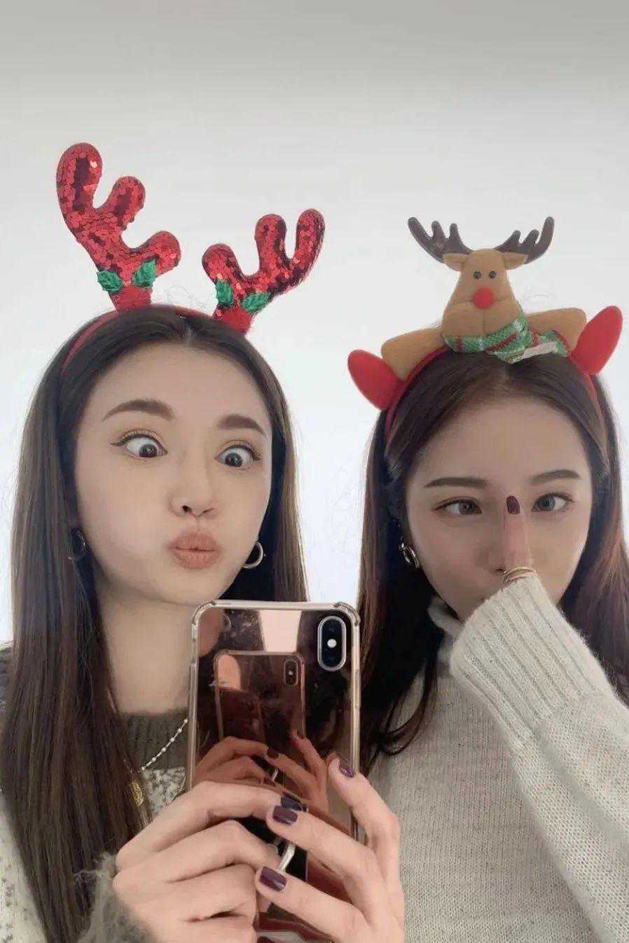 如果你身边刚好有一面镜子,大火的“对镜自拍”快和姐妹安排上,利用手部姿势摆大Pose,这样才不会太呆板无趣,戴上圣诞头饰,可可爱爱的闺密照就出片啦!