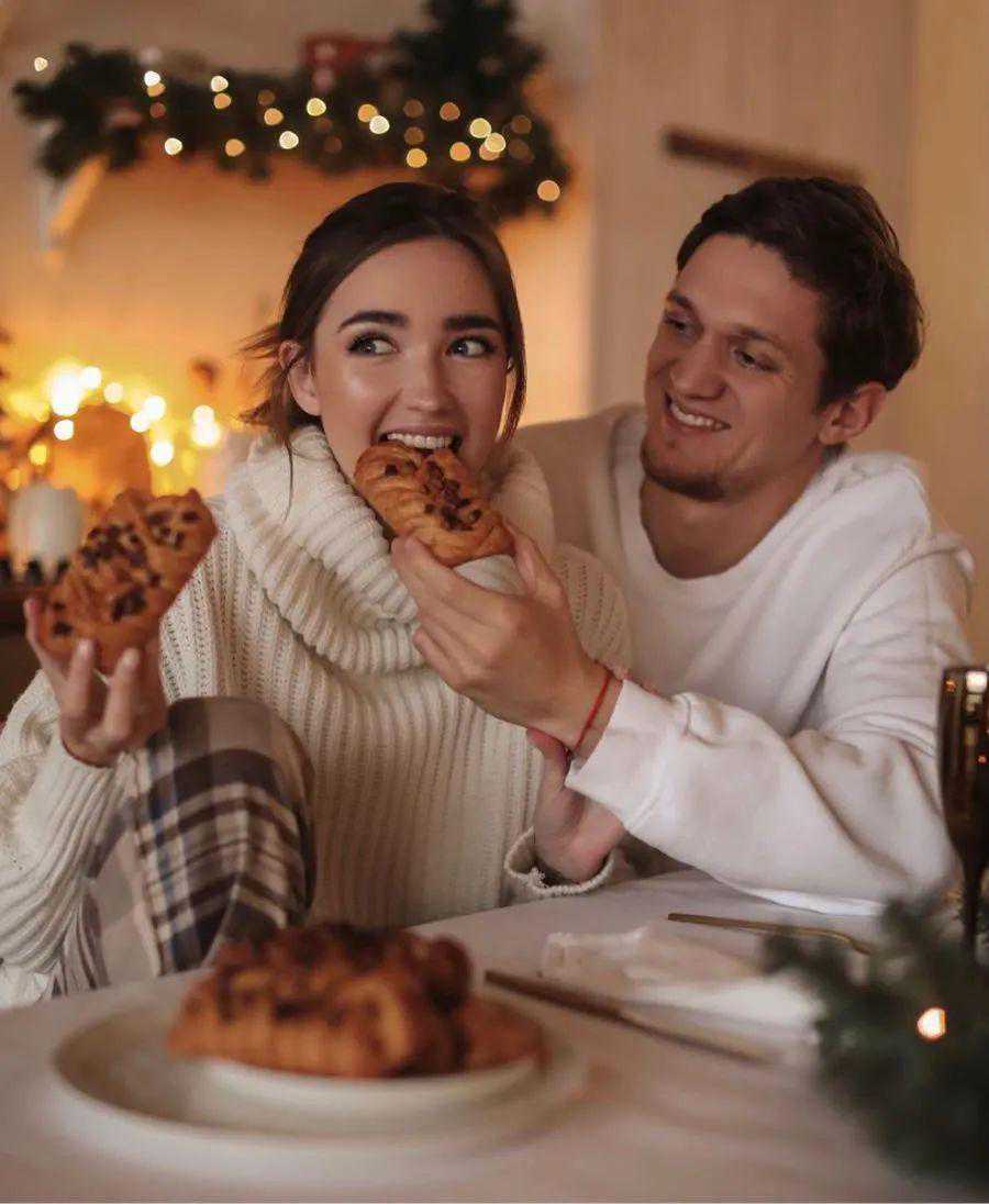 对于不想露全脸、比较害羞的情侣,拍出很有氛围感的情侣照也并不是很难。巧妙借用道具非常重要,这个时候,圣诞帽、围巾、咖啡杯、糖果通通都可以派上用场!