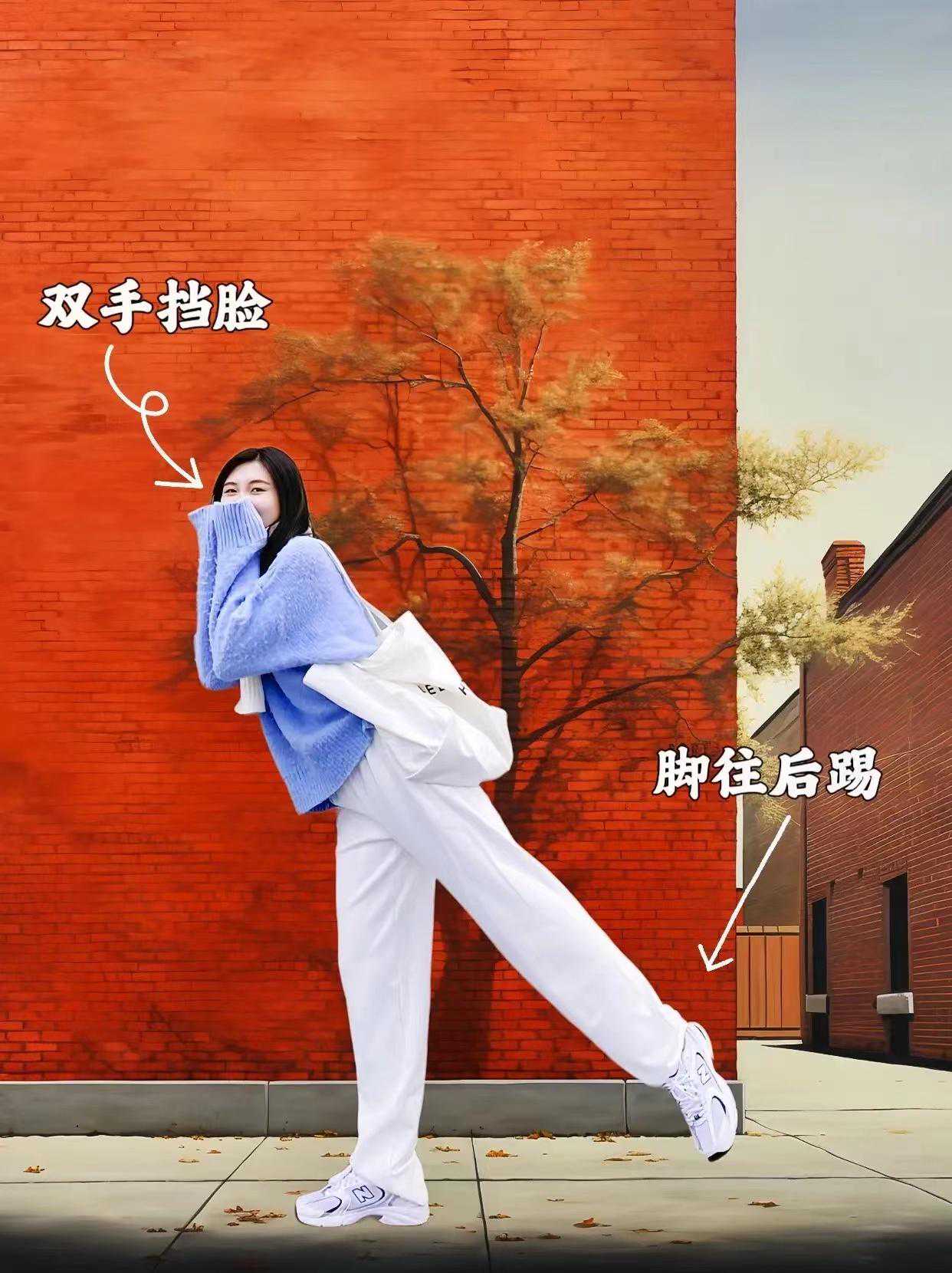 侧身站立,一条腿微微弯曲,另一条腿往后踢出,双手轻触脸部。这个姿势既有趣又充满动感,同时可以展现腿部的修长,让你的大长腿更加引人注目,彰显又高又美的风采。