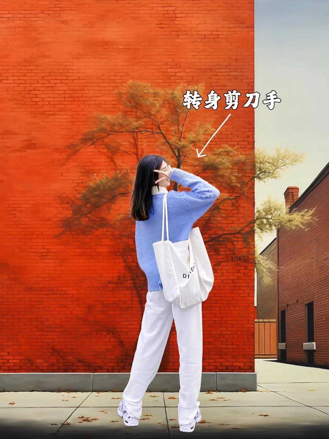 背对镜头站立,然后轻微转身,面对镜头比出剪刀手。这个姿势活泼可爱,同时转身的动作可以让腰部线条更加突出,而且直立的双腿让你看起来拥有又高又美的大长腿。