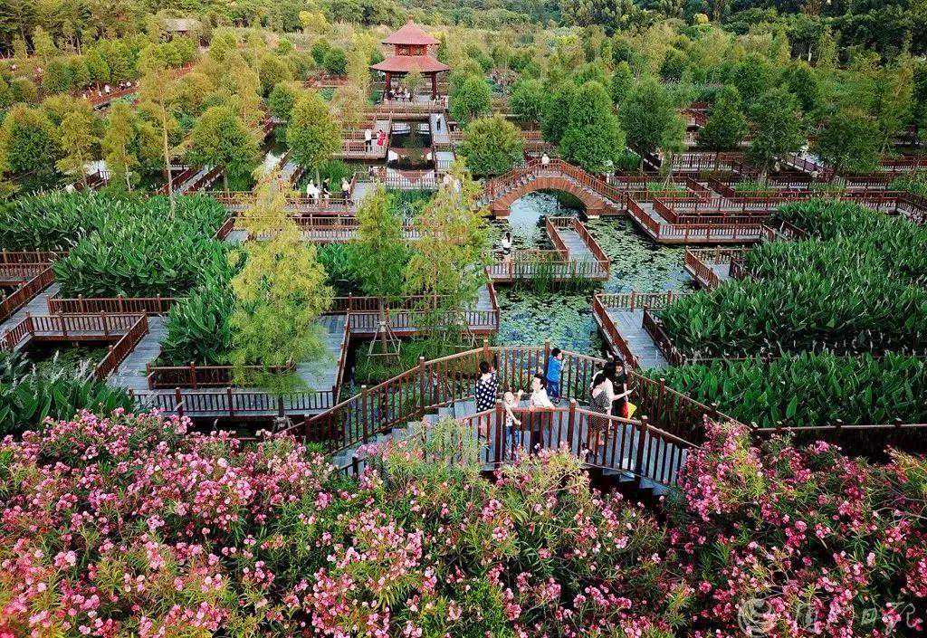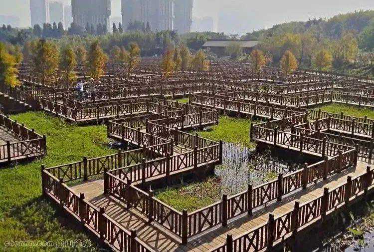 公园里,木栈道连接而成的水上迷宫,蜿蜒盘绕,“漂浮”在浮萍上,似一块块小洲,能轻松营造出一种“所谓伊人,在水一方”的浪漫且富有故事性的氛围。