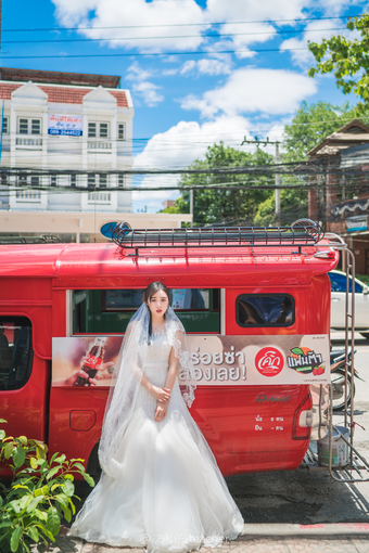 这张片子拍摄时用的35MM的定焦镜头,使用光圈是2.0,用大光圈拍摄的目的是为了突出主体,让杂乱的背景稍稍虚化。这张片子我们在前期设计时选择一辆红色泰国双条车作为主要背景,目的是为了和模特穿的婚纱形成鲜明对比,鲜艳的红色配上中性色白色让人视觉上更加舒适,并且红色也为画面增加亮点,色彩搭配比较鲜明。