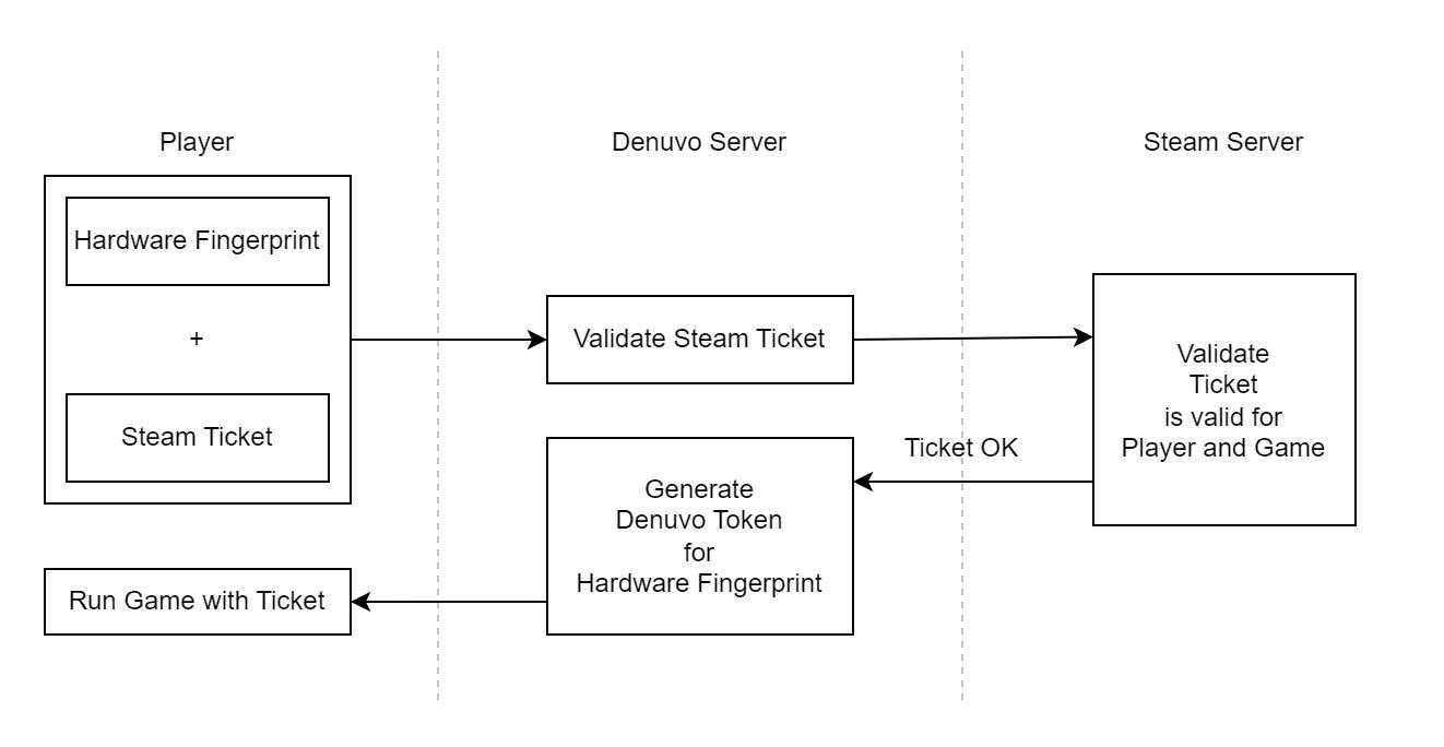 一旦SteamTicket被成功验证,会生成一个Denuvo令牌,该令牌用于在游戏运行时解密某些数据,使玩家能够正常运行游戏,该令牌只能在具有准确指纹的PC上使用。