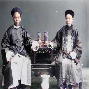 晚清两个官员拍摄的合影,二人坐在茶桌前面,茶桌上摆的茶水杯子造型精致