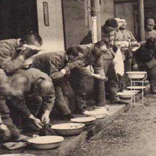群侵华日军,正站在一排洗脸。