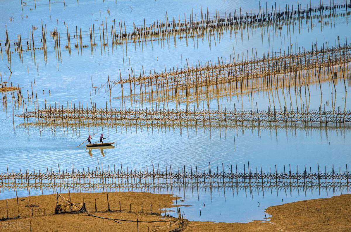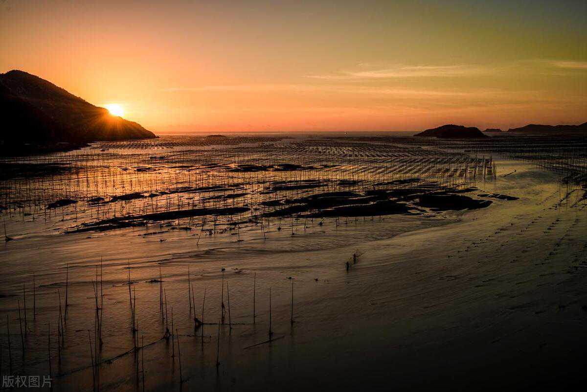 北岐滩涂,中国最美滩涂,滩涂风光如画,也是摄影爱好者的天堂。位于海边的北岐滩涂,养殖着规模较大的海上紫菜和生蚝,每当退潮的时候,滩涂上就显露出宽广的沙滩,日出晚霞的光芒挥洒在这片滩涂上,映照出道道花纹,犹如一幅绝美的艺术品。