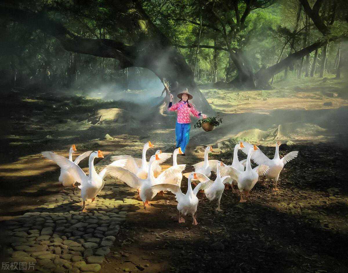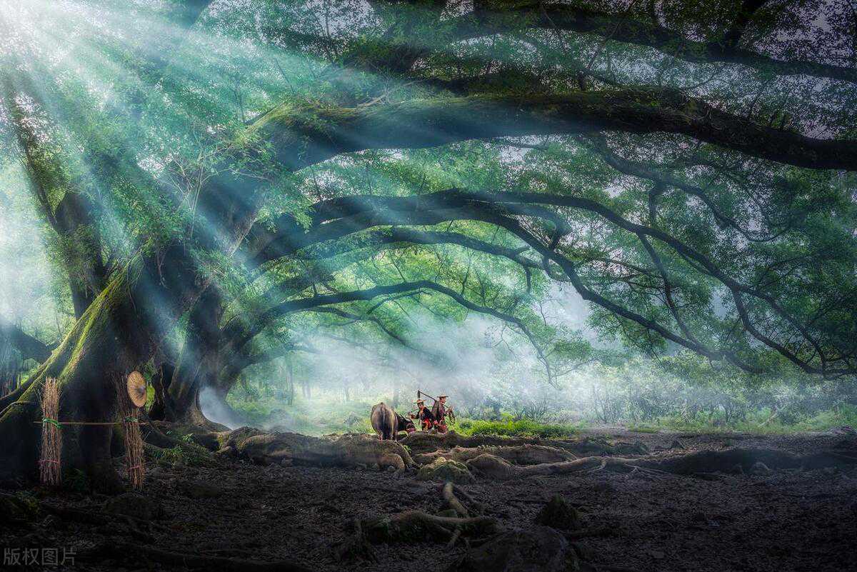 杨家溪,风光秀美,以拥有大片的榕枫林而出名,分布着一片古榕树群和江南较大的纯枫叶林。树木翠绿成荫,阳光从树叶的缝隙中穿过,光影交错,老人牵着牛,从树下缓缓走过,在烟雾的映衬下,显得更加仙气十足,还有村姑赶鹅的场景,都很唯美。