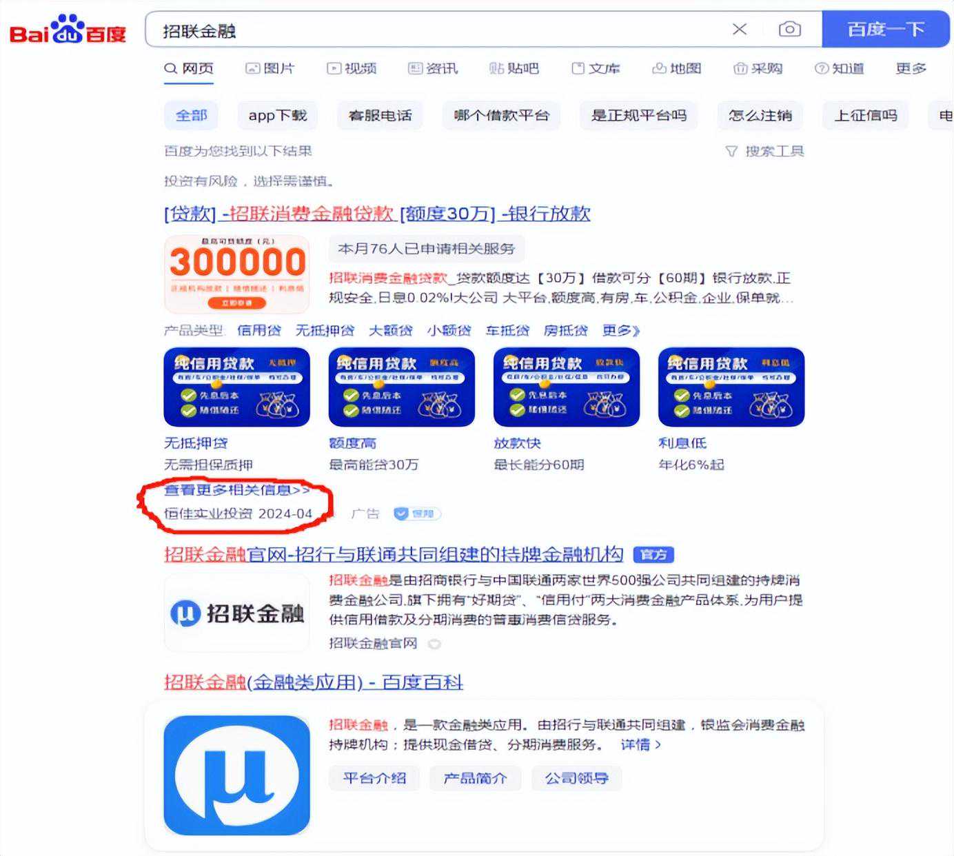 《独角兽观察》在百度搜索上搜索行业头部企业“招联金融”,出现的置顶第一条看着似乎是招联消金的链接,但实际为一家“恒佳实业投资”的企业,点开链接就是一个借款页面。