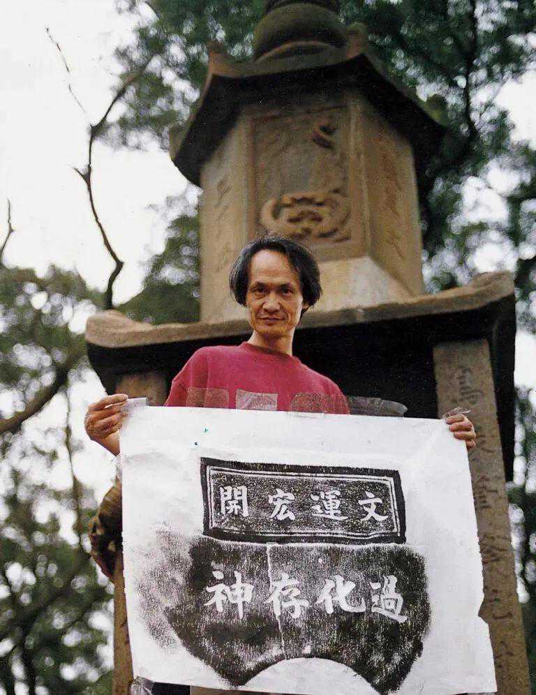 下图:黄永松在抢救龙潭圣迹亭现场,展示圣迹亭炉口上方石刻拓片.