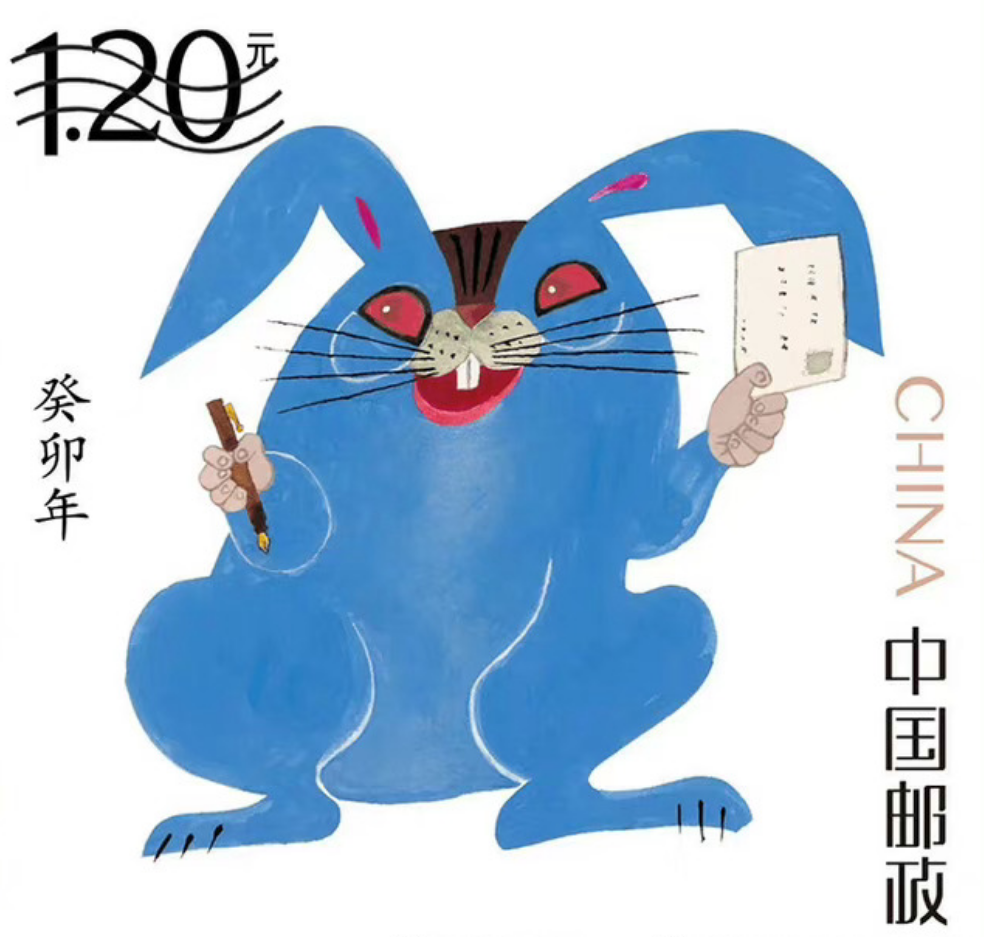 左图:黄永玉创作的兔年纪念邮票“蓝兔子”。