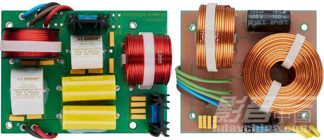 中音部分和低音部分就同时修改了分频器和驱动单元。在分频器部分,中音将原来的1只电容变成2只同等数值的电容来代替,在总容量相等的情况下,2只同等数值的电容代替可以降低ESL(等效串联电感)和ESR(等效串联电阻),可以改善滤波作用。低音分频器上使用了空心电感。好处是避免磁导体引起的磁饱和而产生的失真。还有分频器上的旁路电容同样进行了升级。而中音和低音驱动单元都改良了磁路,还加大了通风口以加强散热。低音更使用了弹性更好的定心支片,改良了盆架,可以起到改善低频延伸,并降低音染的作用。